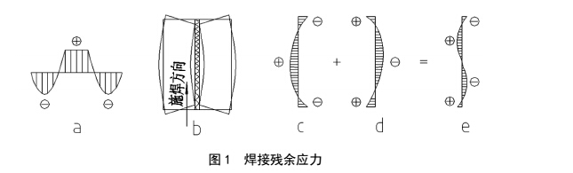 a縱向殘余應力;b焊接殘余變形;c橫向殘余應力(縱向收縮引起的);d橫向殘余應力(橫向收縮引起的);e橫向殘余應力總和