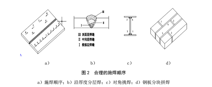 ①采取適當的焊接順序和方向,例如為了使每次施焊產生的殘余應力和殘余變形有所抵消,應盡量采用對稱焊、分段焊、厚度方向分層焊、鋼板分塊拼焊、工字形頂接時采用對角挑焊;為使收縮量或受力較大的焊縫留有伸縮余地,減小殘余變形,先焊收縮量較大的焊縫,后焊收縮量較小的焊縫;先焊受力較大的焊縫,后焊受力較次要的焊縫;鋼板分塊拼接先焊短焊縫,后焊直通長焊縫。圖2中的阿拉伯數字表示施焊的順序。