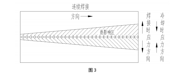U型梁結構的地磅承載器目前都是采用連續自動焊接的,正是由于連續焊接,所以在焊接時“熱影響區”越來越大,鋼材產生膨脹也大;而冷卻時鋼材產生收縮,內部就產生內應力,給承載器帶來變形的隱患,焊接和冷卻時應力方向如圖3所示.