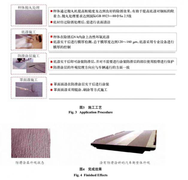 涂裝前,需對衡器秤臺表面進行拋丸/噴砂處理;表面除塵清潔之后,依次涂防腐底漆、防滑涂層和罩面漆。防腐底漆和罩面漆可采用輥涂、噴涂等方式施工,防滑涂層使用專用工具輥涂施工。